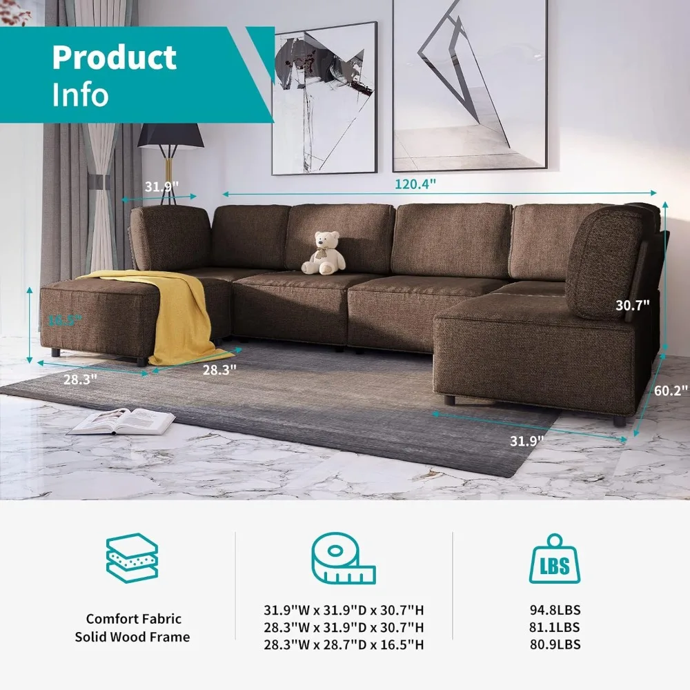 120" Sectional Sofa for Living Room,U Shaped Modular Sofa Couch with Ottoman, 6-Seat Oversized Sleeper Sofas Deep Seat