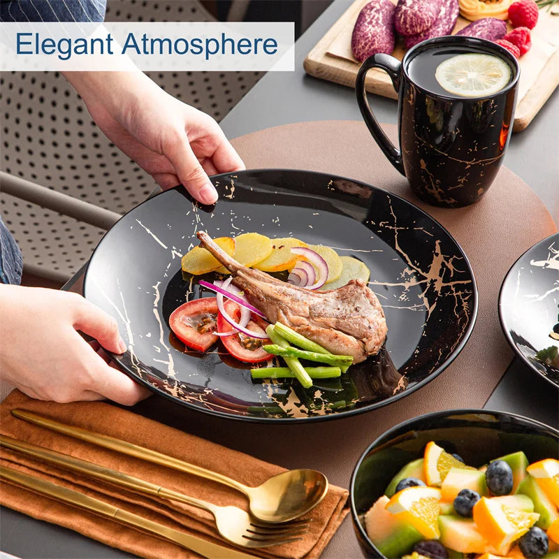 16Pcs Black Procelain Tableware Set Design By Gold Splash with Dinner Plate/Cake plate/Bowls/Coffee Cups Kitchen Dinner Ware Set