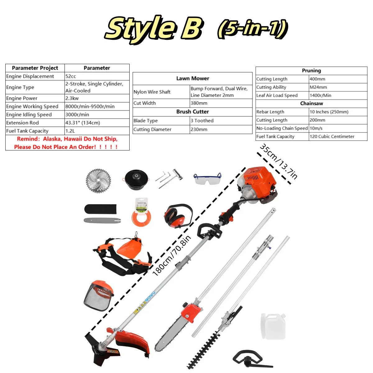 - Powerful 52cc 2-stroke engine: a diaphragm carburetor delivers up to 2.2 kW at 8,500 rpm, with a 25:1 oil mix and a 1.2 L tank for steady performance.