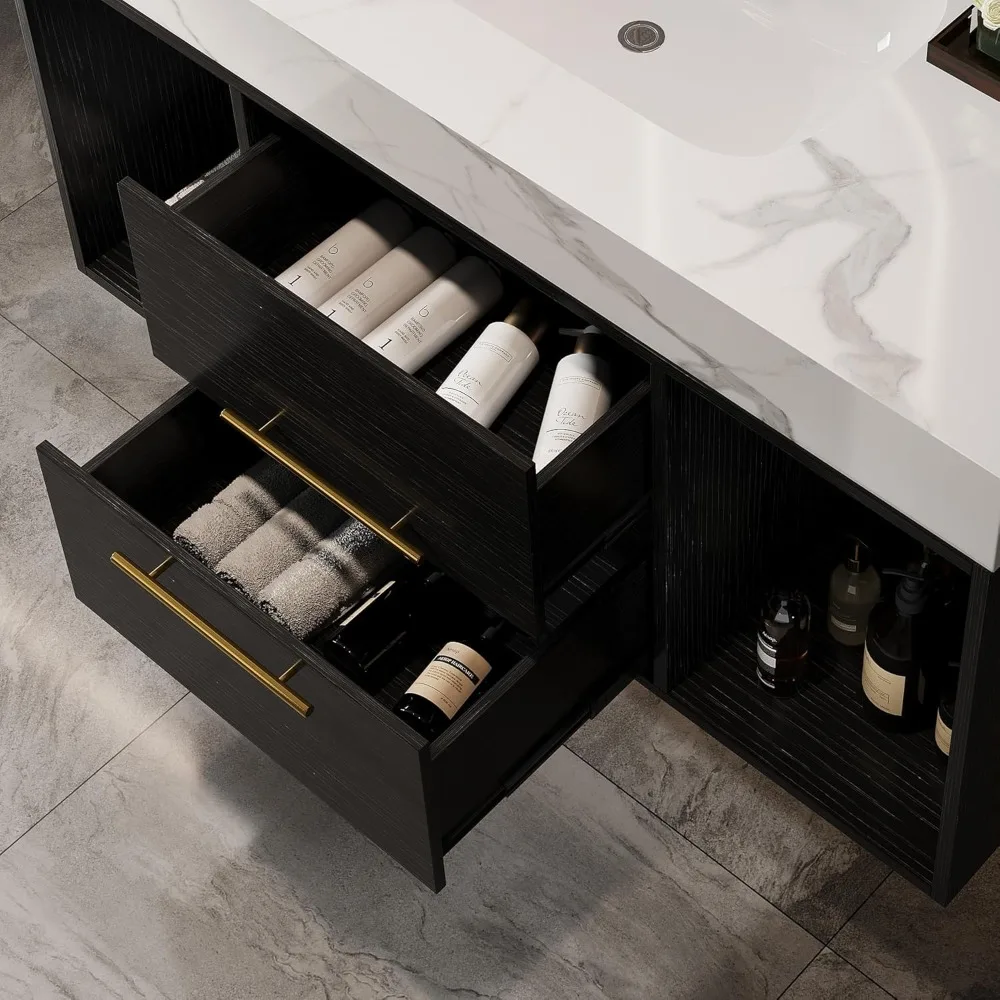 - 【Modern Design with Luxurious Touches】This sleek 40-inch floating bathroom vanity features a striking black cabinet with elegant golden long handles, paired with a stylish sintered stone countertop and ceramic sink. The modern design adds sophistication to any bathroom decor.