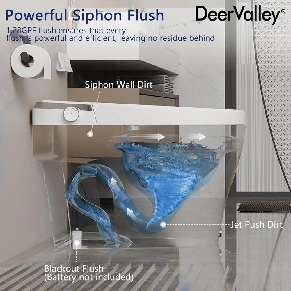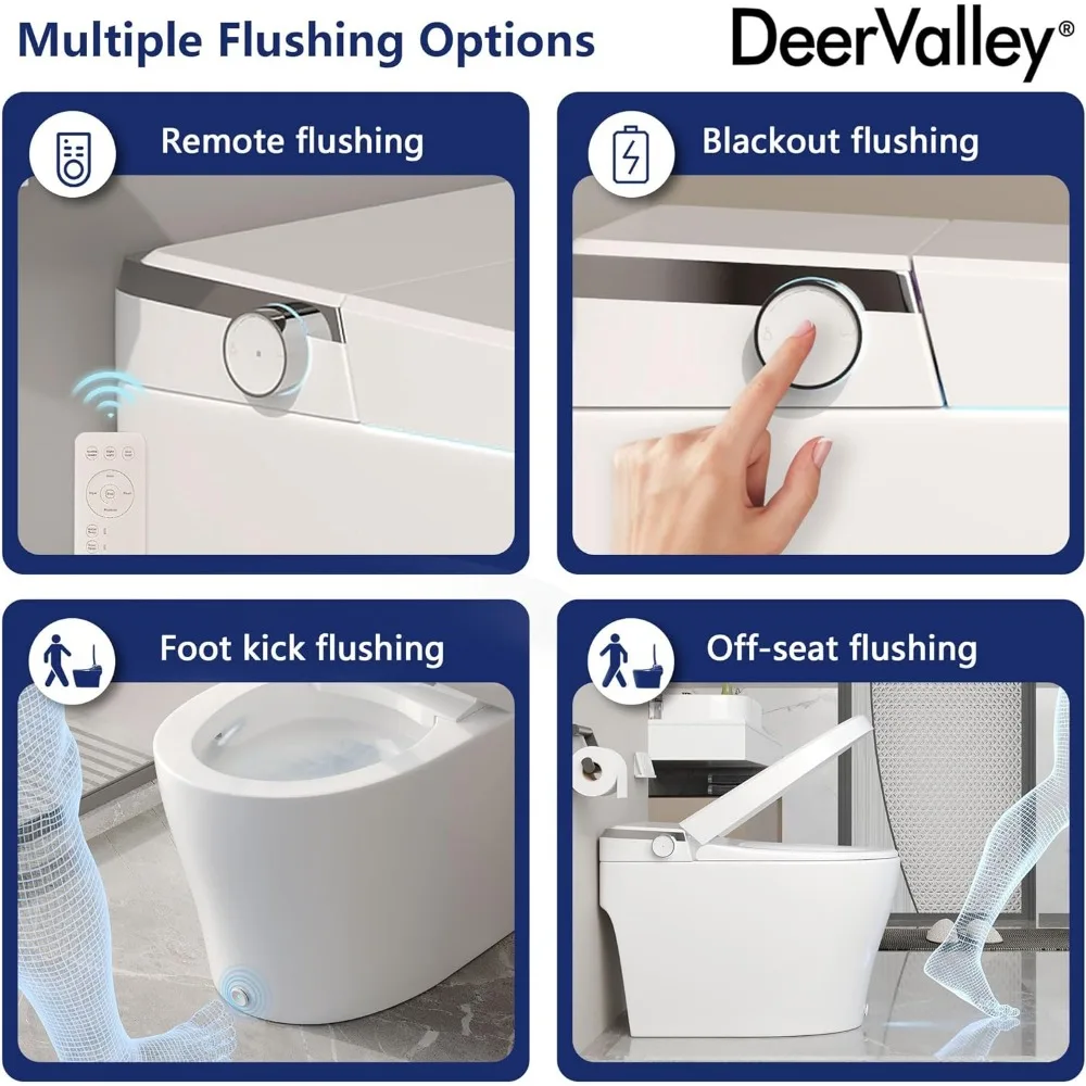 - 【Efficient Flushing】DeerValley's tankless smart bidet toilet offers four flush options: automatic seat sensor flush, Kick-flushing, knob flush, and remote control flush. With a 1.28 GPF siphon flush, it provides a powerful yet quiet flush. The toilet automatically releases water upon seating, moistening the inner bowl to prevent dirt from sticking, making cleaning easier. Plus, there's a backup flush function for use during power outages.