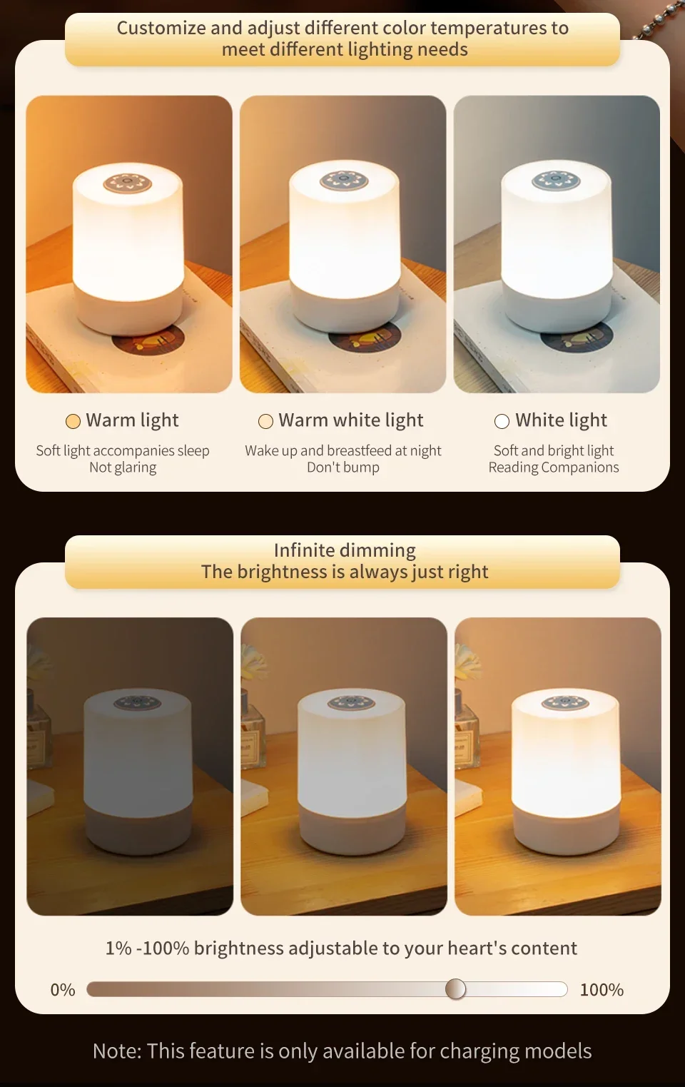 Infinitely dimmable: the light can be adjusted, long press to adjust the brightness to suit your own, soft light eye protection, accompanied by your sleep, easy to play the phone at night to read without hurting your eyes.