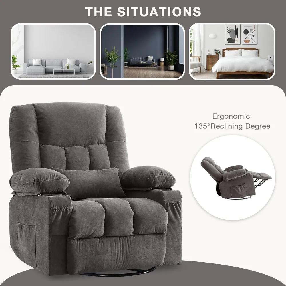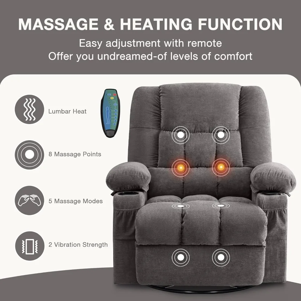 - γπ©πππ₯ππ§ππ’π‘ π ππ¦π¦πππ & ππππ§ππ‘πγ:This swivel rocker recliner with massage features 8 vibration massage points and 2 intensity options, catering to your unique needs. Targeting calves, thighs, waist, and shoulders, it allows for customized control of massage locations and intensities. Additionally, the waist area includes a heating feature to enhance blood circulation during your massage sessions.
