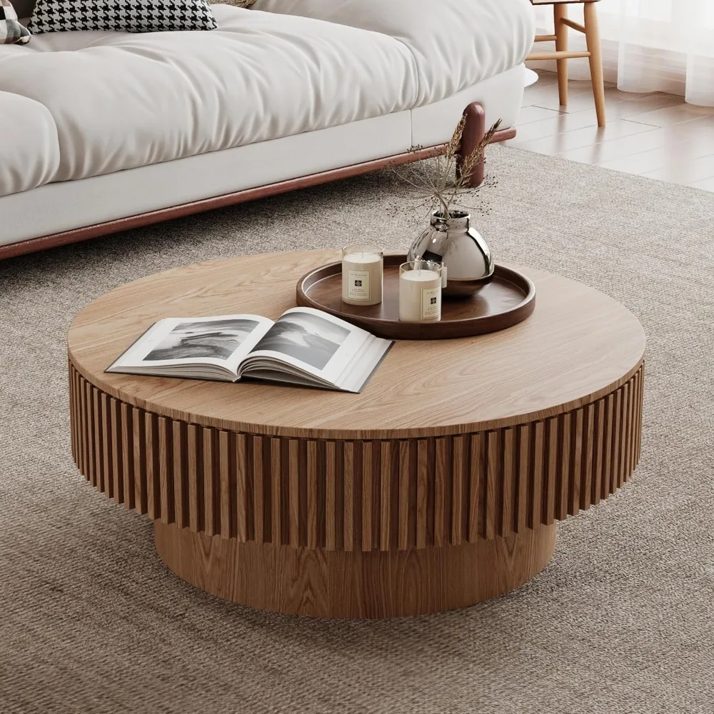 Modern Circular Coffee Table with Storage, Luxury Drum Style Center Table, Solid Wood Veneer Accent Side Table