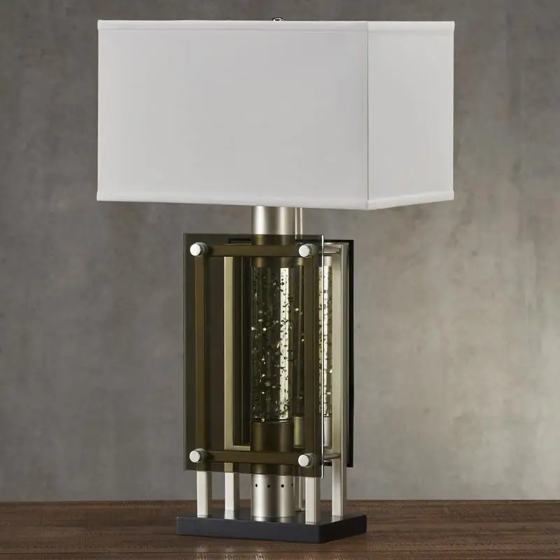 This accent lighting can change the ambiance of any room. Its ultra modern design showcases sparkling decorative mood light, with tiny rippling water-droplets to simulate the soothing dancing water motion. Beautifully crafted stand features high quality satin nickel finish metal and glass, and an elegant rectangular lamp shade on black base. Great addition piece on your night stand, end table, or sofa table. It offers flexible lighting solution: a table lamp with a main light that is suitable for reading, perfect for a night light, and to create the mood in any room.