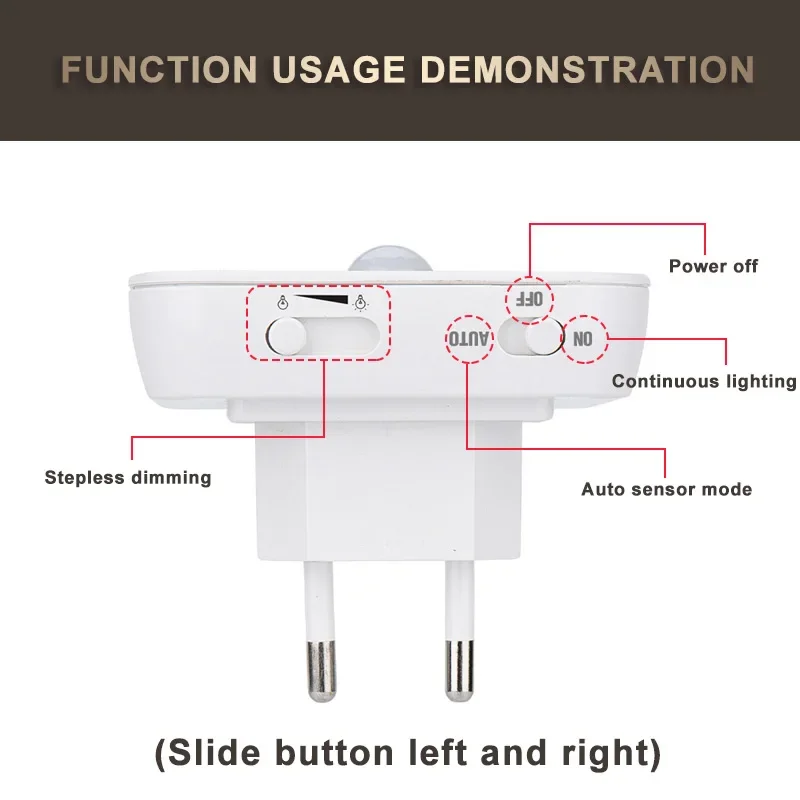 * Switch button, when you slide the button to "ON" - always light mode on; when you slide the button to "AUTO" - smart sensing mode (when it is in a dark place or at night when people pass by. It will automatically work on .); when you slide the button to "OFF", it will automatically turn off and stop working.
