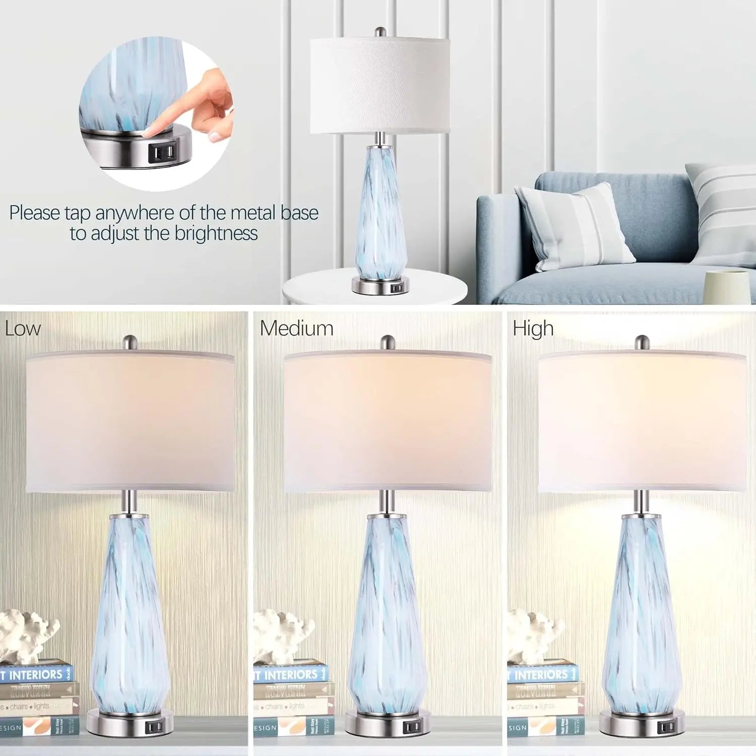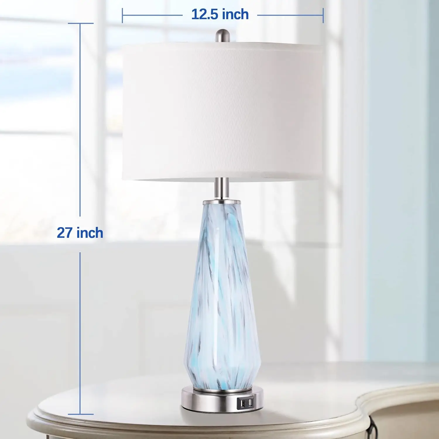 odern Table Lamp Set of 2 Touch Control, 27" Tall Faded Swirl Blue Gray Art Glass Bedside Lamp with USB Ports, 3-Way Dimmable