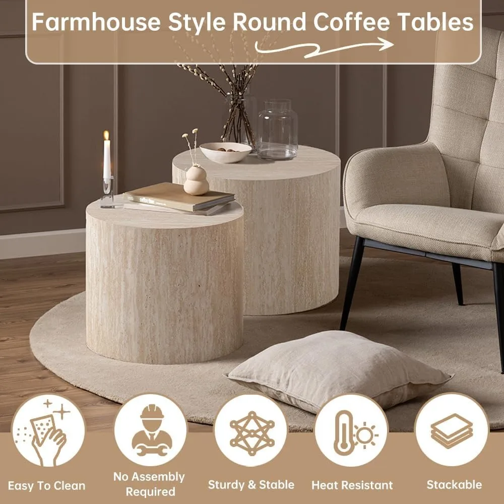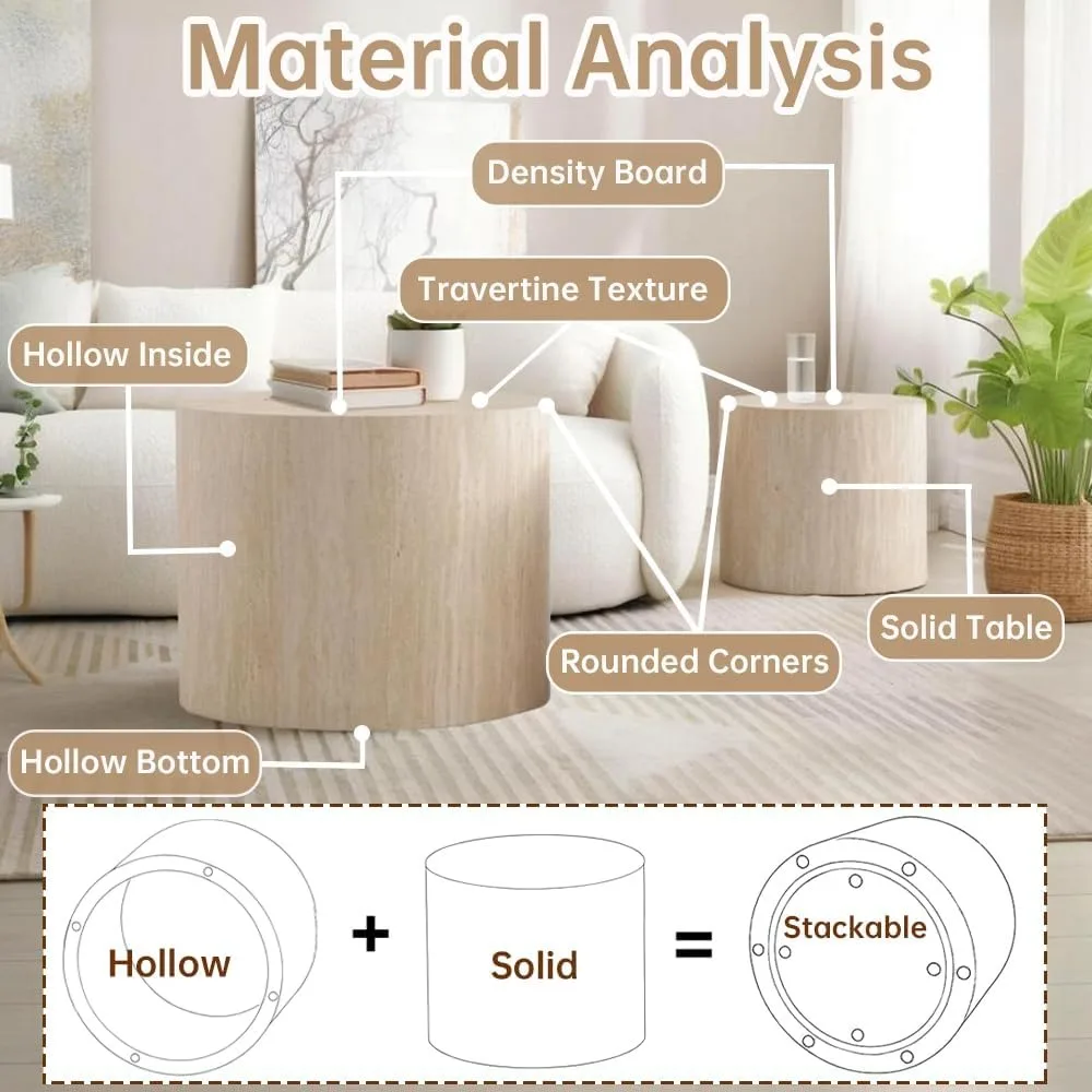Pair of Modern Nesting Coffee Tables - Small Circular Travertine Side Tables for Home Decor