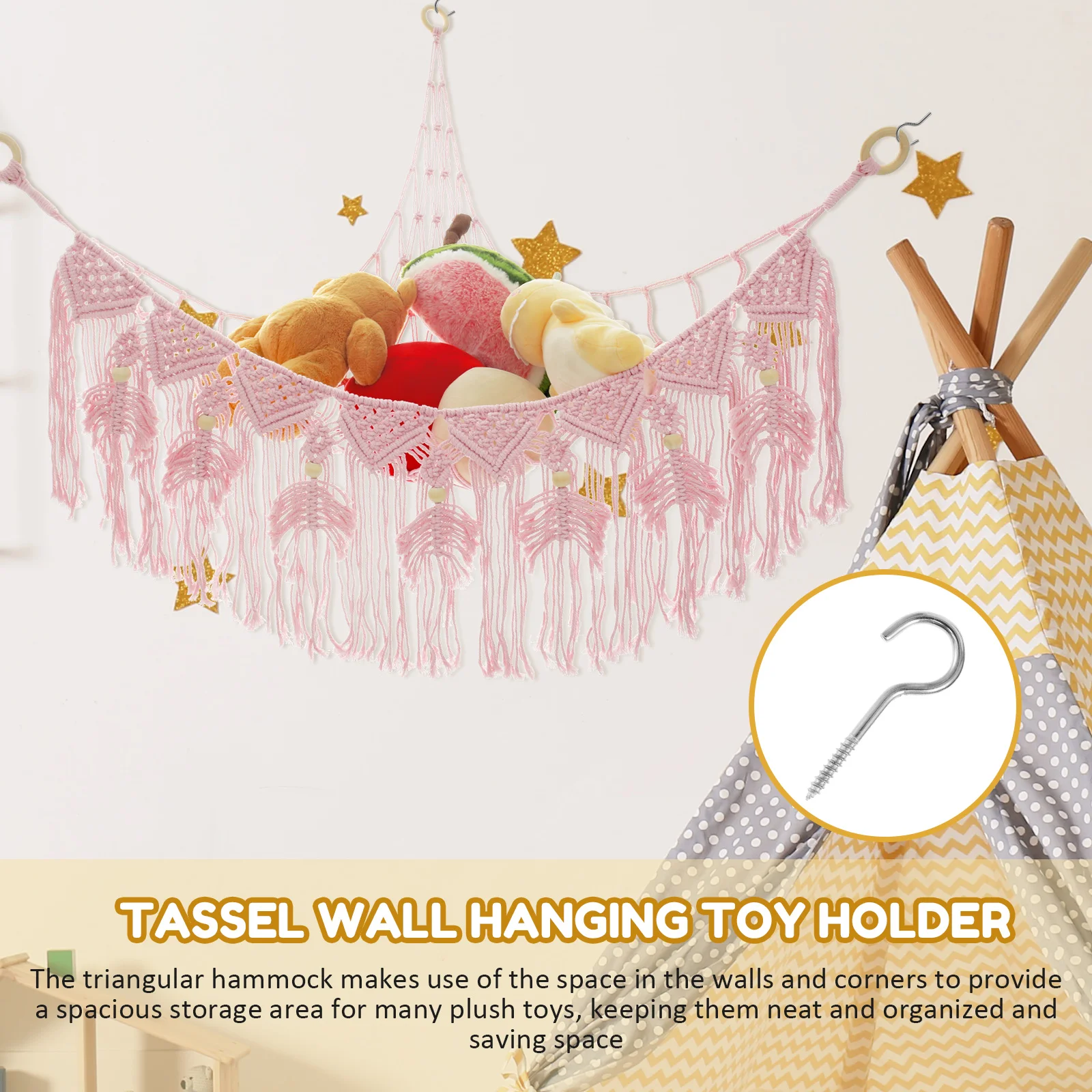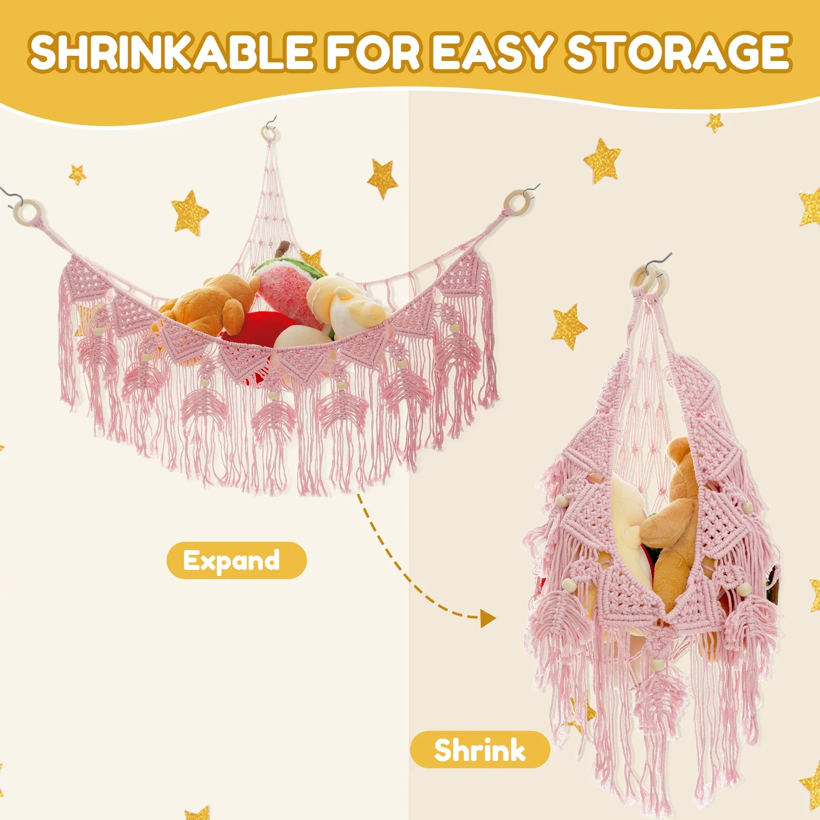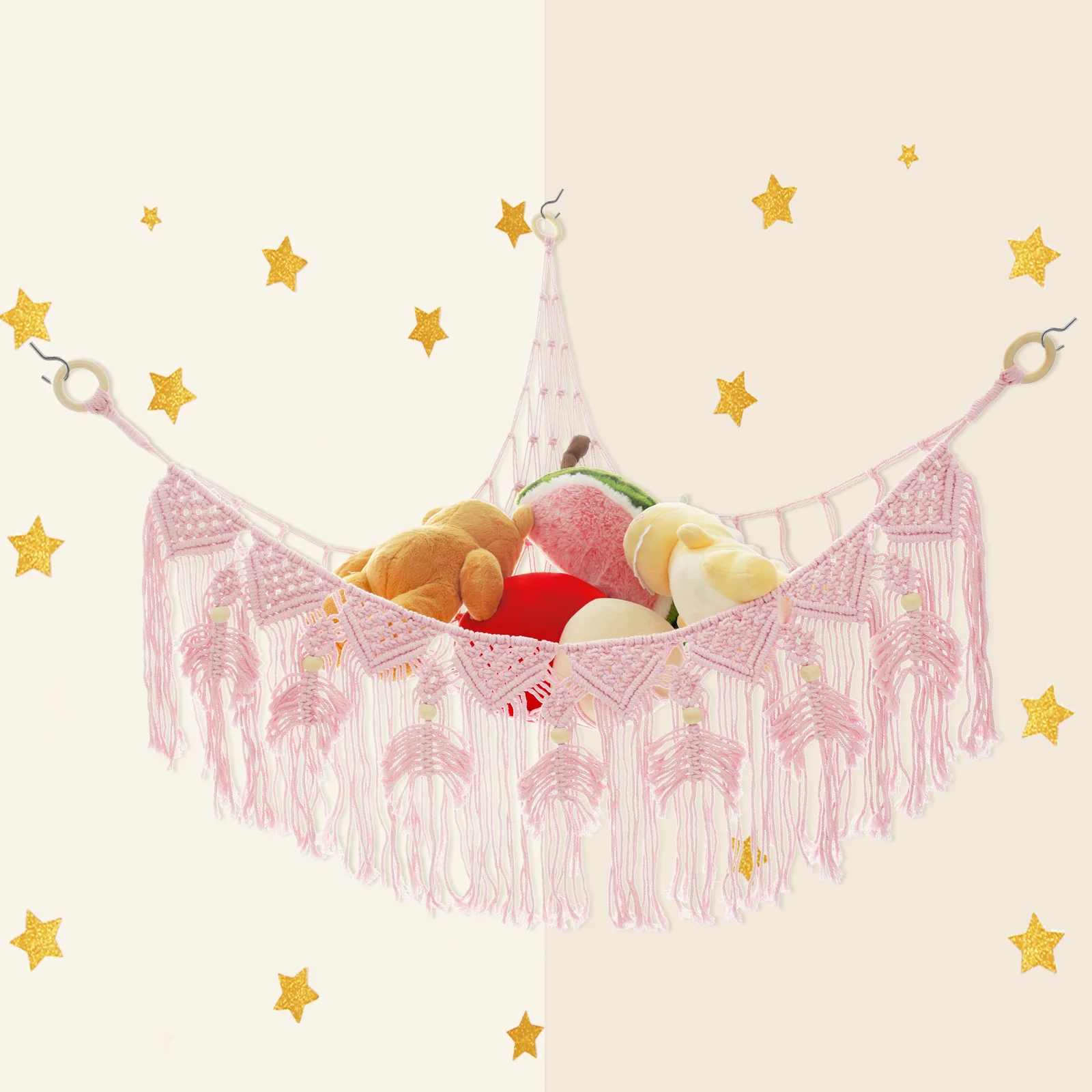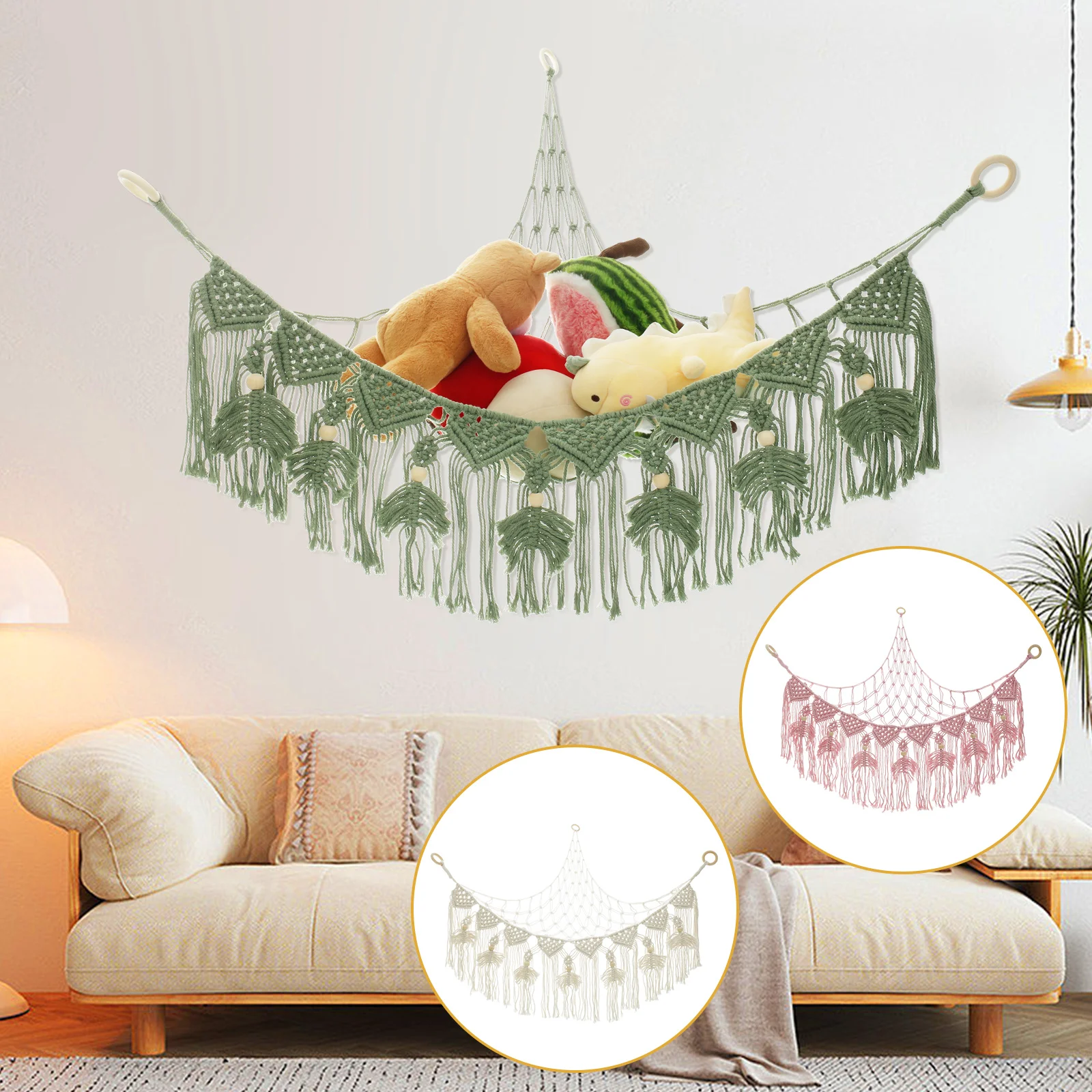 Multipurpose: Plush toy hammock with bohemian leaf tassels; wooden hanging rings and beads; not only a toy storage organizer for playroom; bedroom; nursery; kindergarten; girls and boys bedroom; kids room; but also a unique room decoration; multiple colors for your choice