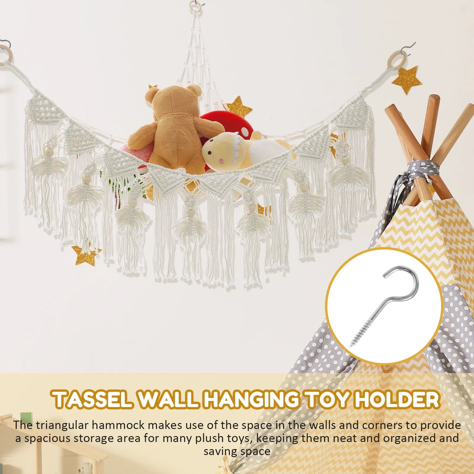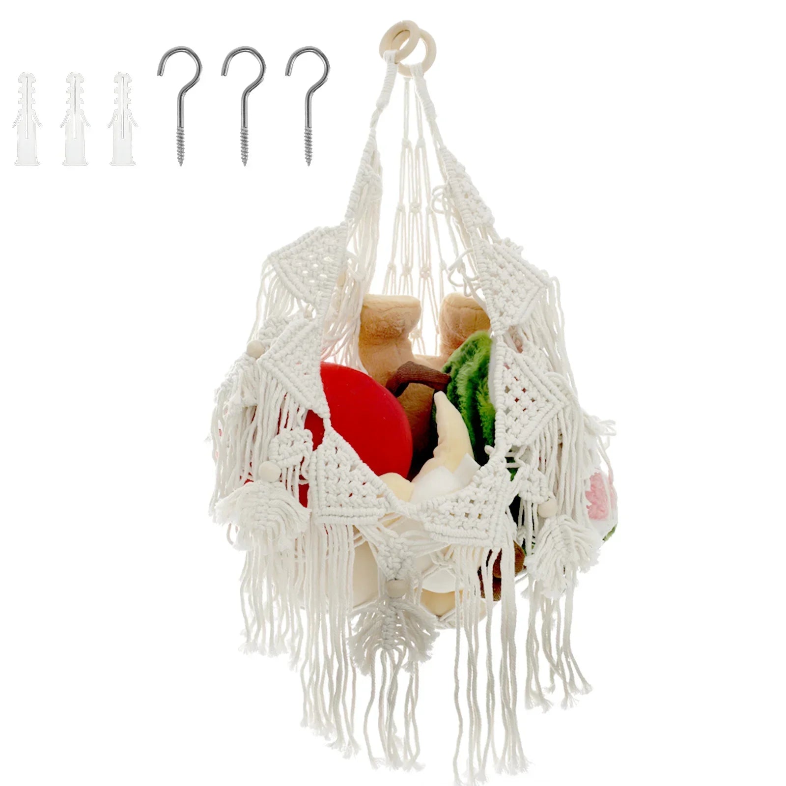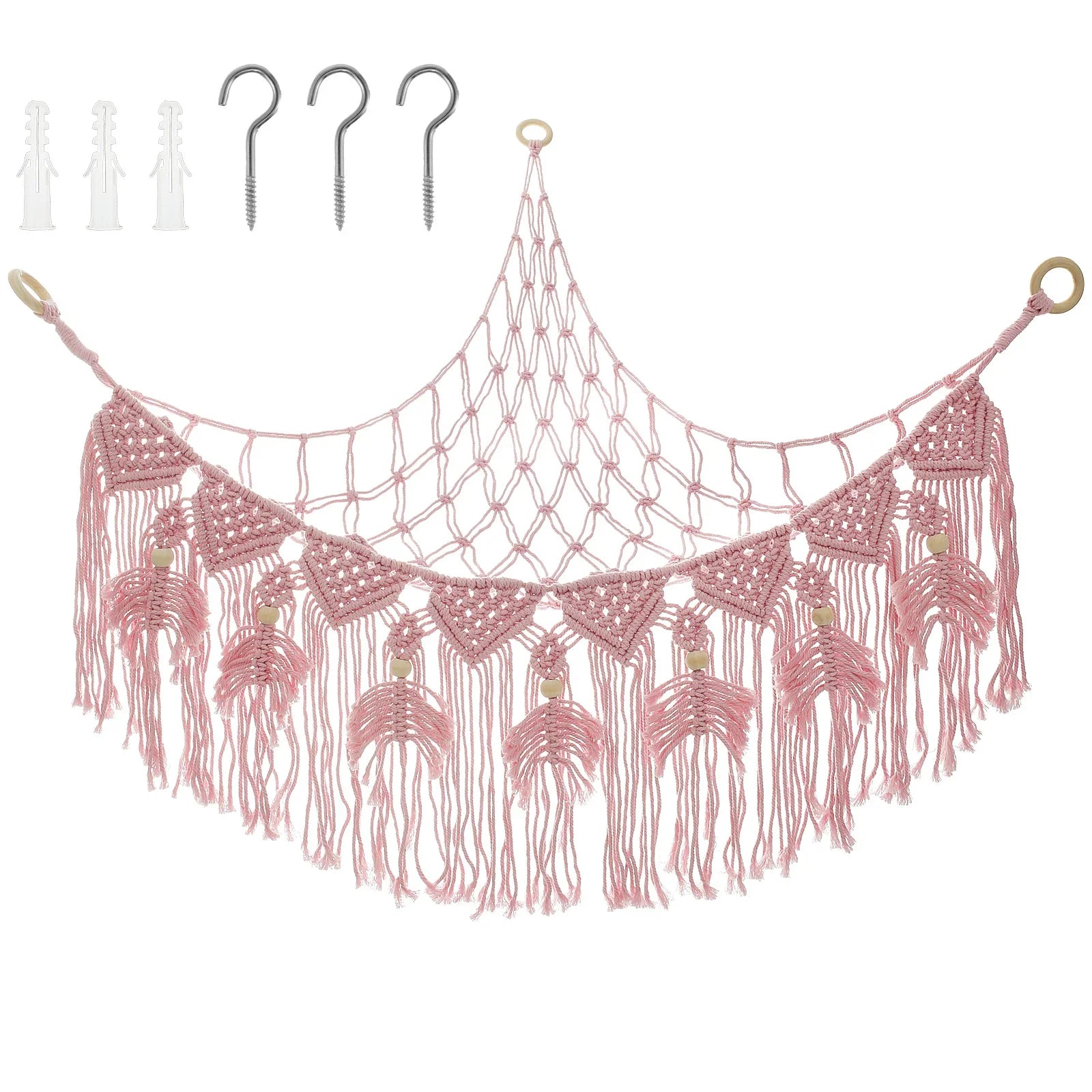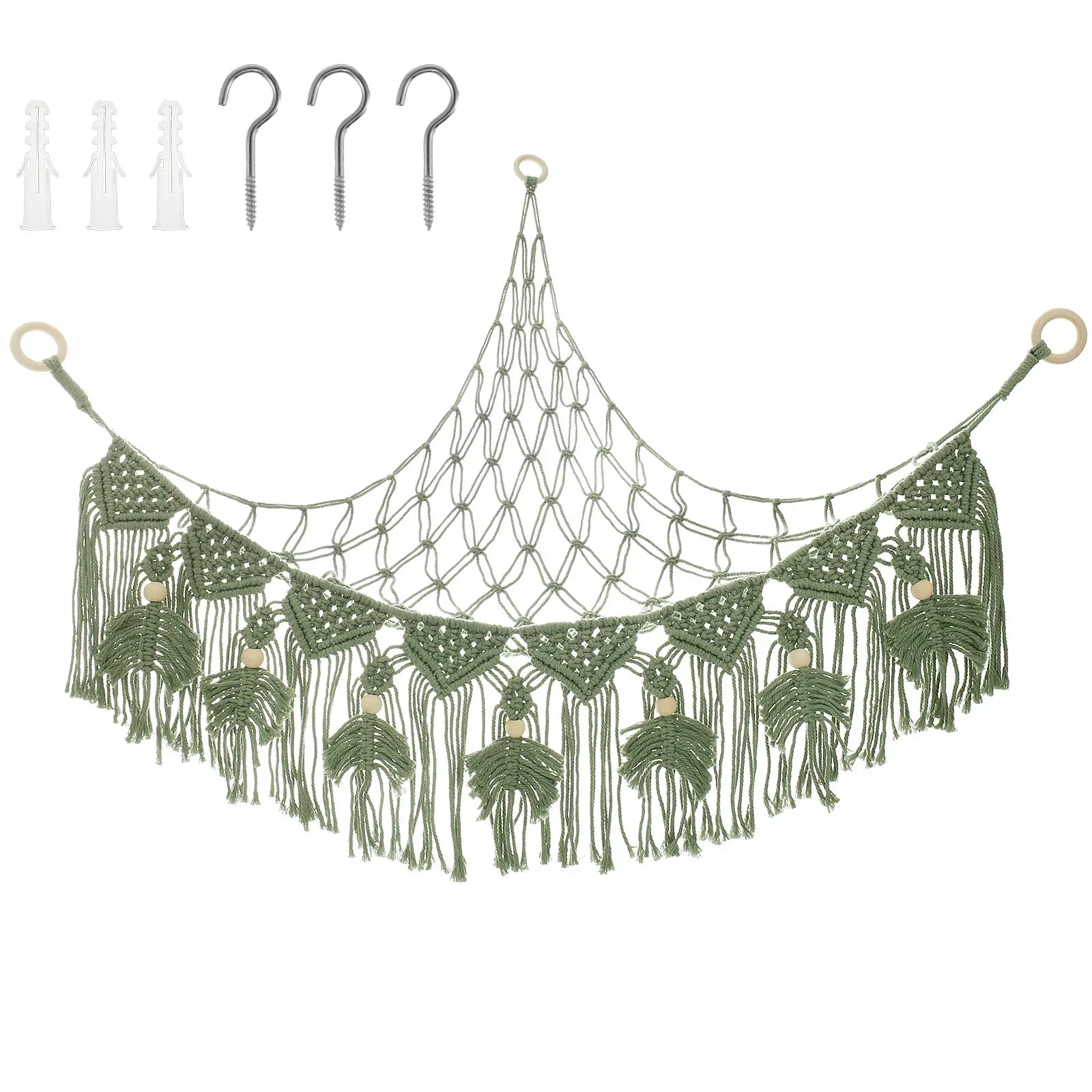 Multipurpose: Plush toy hammock with bohemian leaf tassels; wooden hanging rings and beads; not only a toy storage organizer for playroom; bedroom; nursery; kindergarten; girls and boys bedroom; kids room; but also a unique room decoration; multiple colors for your choice