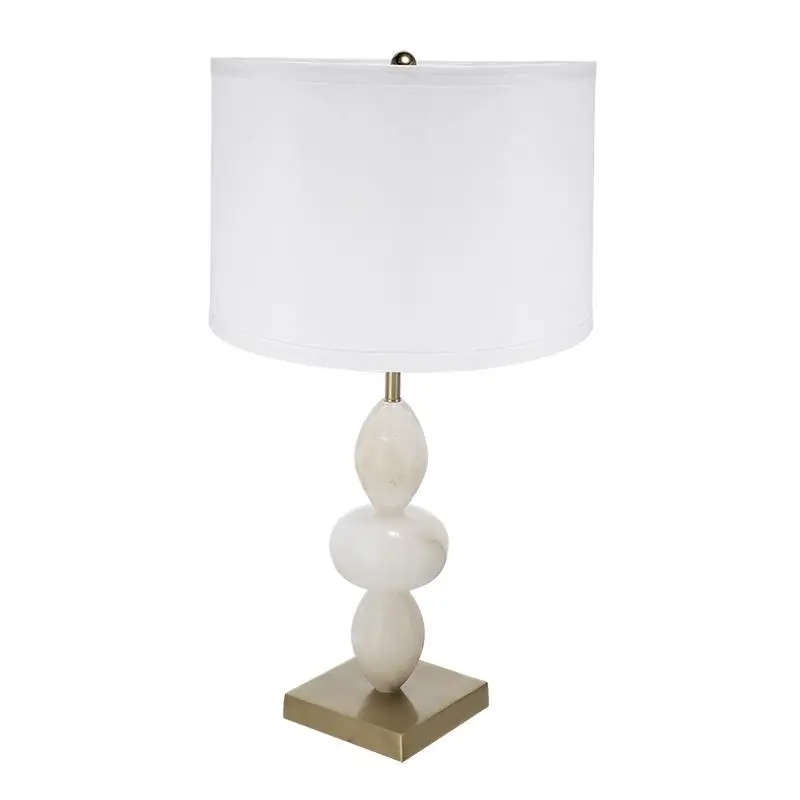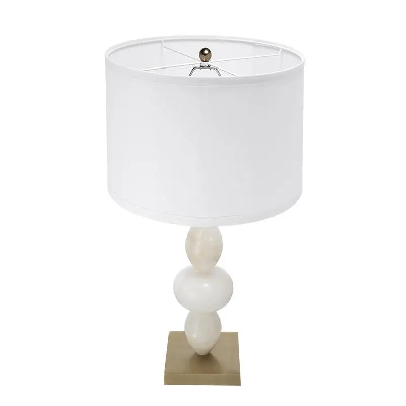 As contemporary as it is intriguing, this table lamp features three round alabaster accents, two vertical and one horizontal, a classic white drum shade, and a gold aluminum base.